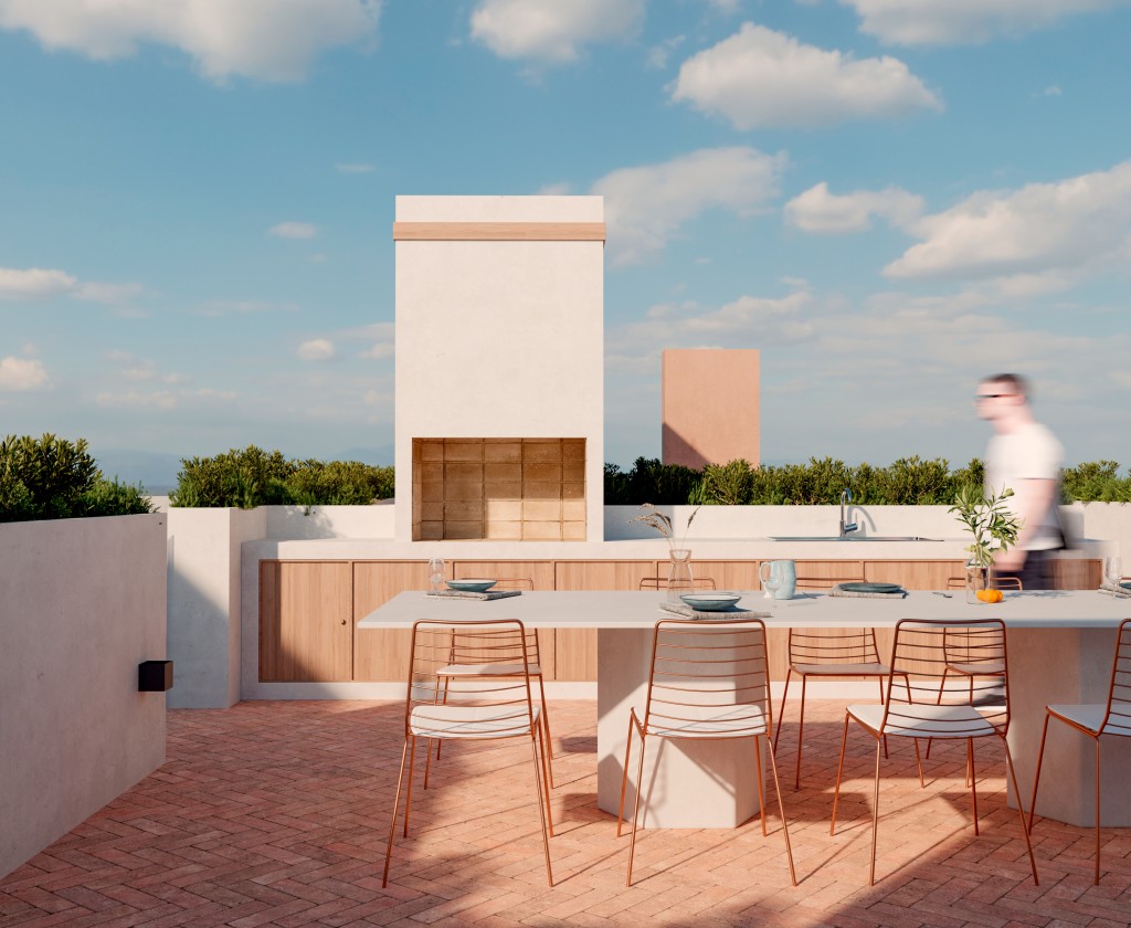 Posee una terraza comunitaria de más de 40m² en un espacio central luminoso y abierto, que incluye una barbacoa, lavadero para perros y ducha colectiva.