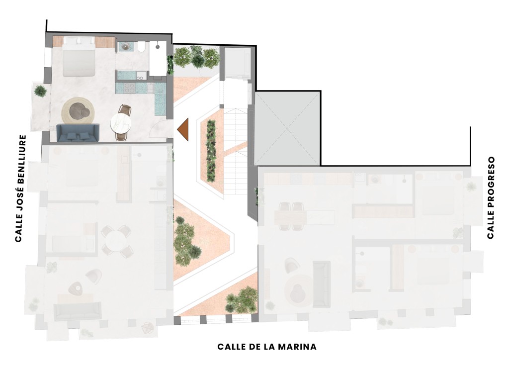 MARINA 25 se distribuye en tres alturas, con un total de nueve apartamentos concebidos para diferentes usos, tanto turísticos como residenciales privados.
